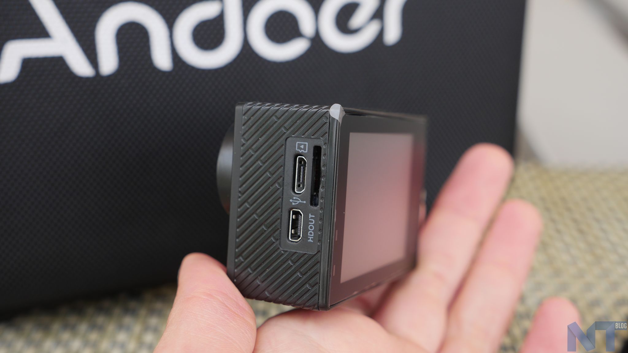 Sur le côté opposé de la caméra d’action Andoer 4K, vous trouverez une fente pour insérer une carte micro SD pouvant accueillir jusqu’à une carte mémoire de 64 Go. Il existe également un connecteur micro USB qui sert à charger la caméra, et une sortie HD pour retransmettre sur un téléviseur par exemple. Notez que la caméra Andoer 4K n’est pas commercialisée avec un câble mini HDMI. Ce côté de la caméra possède également un microphone intégré.