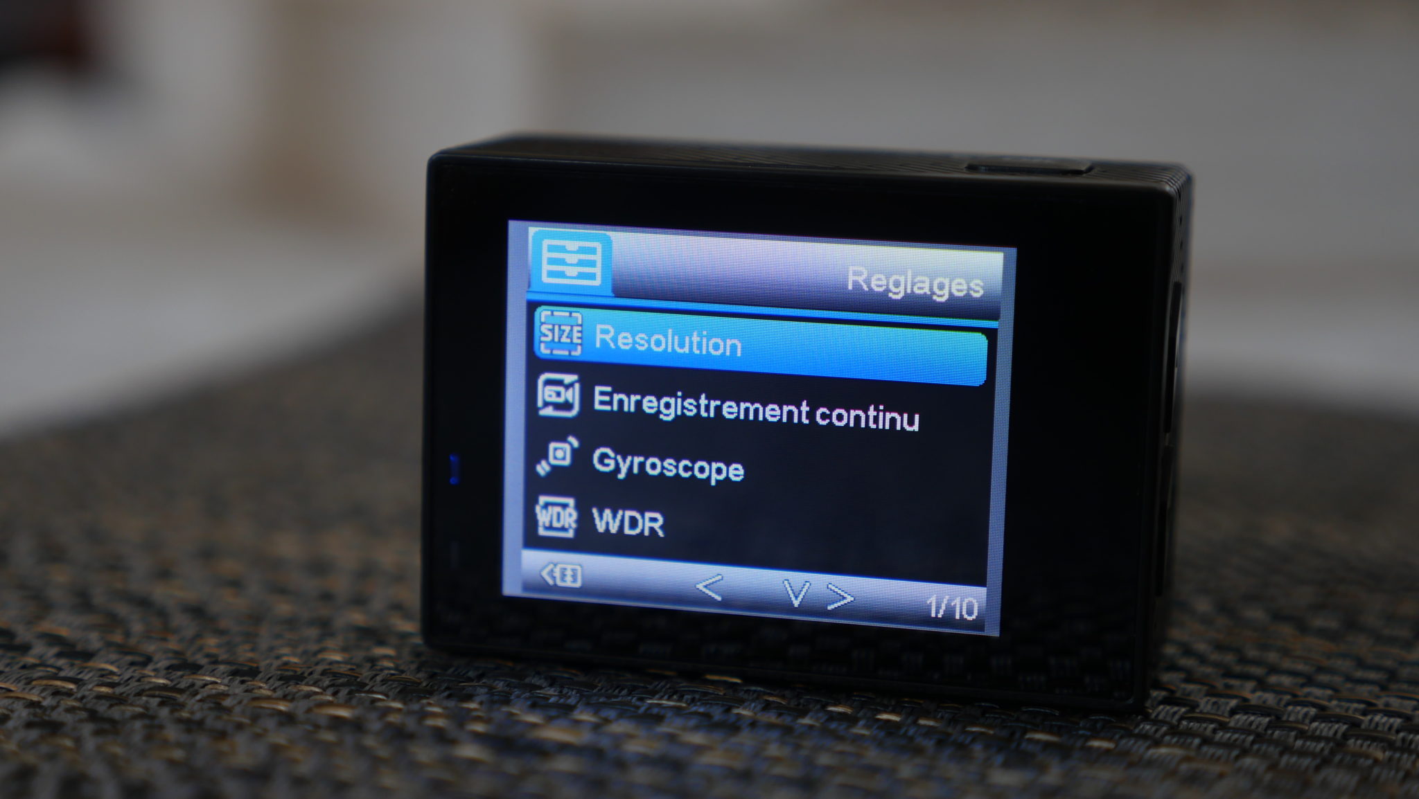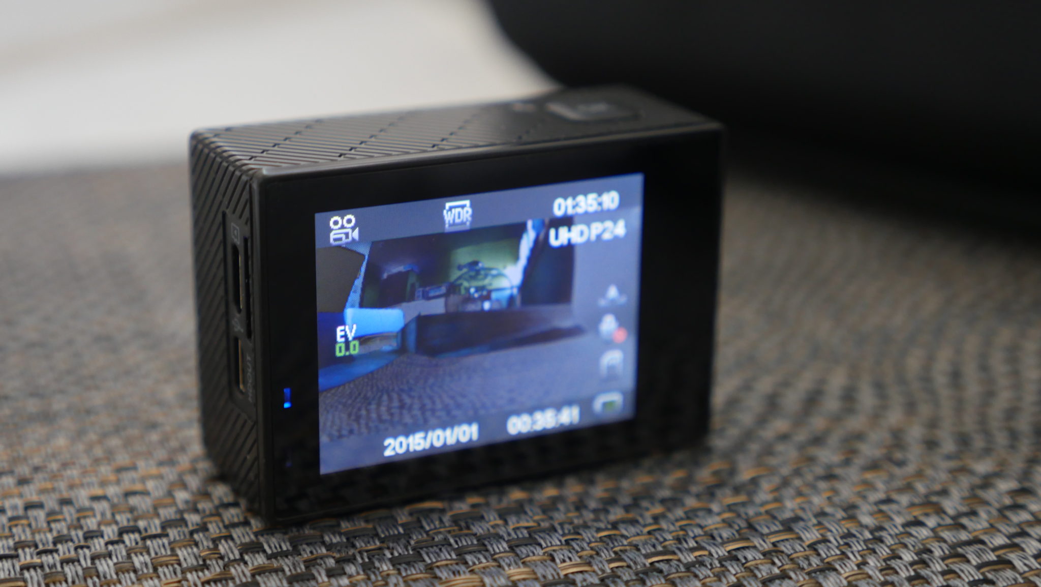 L’écran de 2 pouces à l’arrière de l’appareil photo est utilisé comme viseur. Il montre le mode, la résolution, la disponibilité de l’espace sur la carte de stockage, ainsi que le statut Wifi et le chargement. La bonne nouvelle est que vous pouvez charger et capturer des vidéos en même temps – très pratique si vous visitez une ville et que vous avez une batterie externe avec vous.