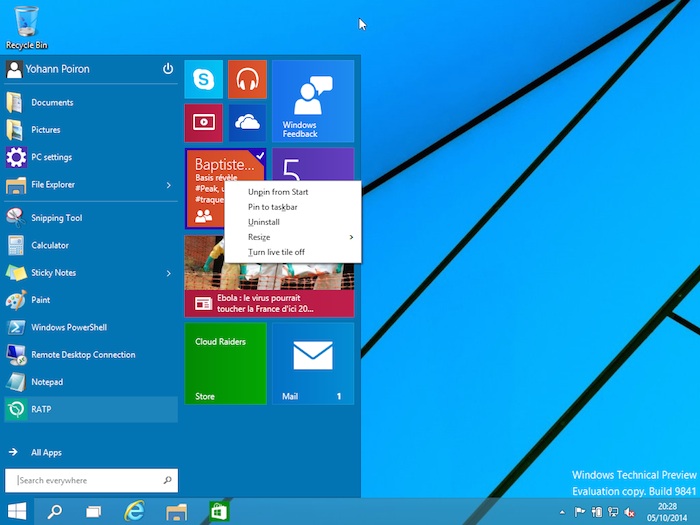 Les tuiles sur le côté droit du menu Démarrer ont et fonctionnent de la même manière que les tuiles sur l’écran d’accueil de Windows 8.x. Vous pouvez lancer une application en cliquant dessus, et si vous faites un clic droit sur la tuile, vous serez en mesure de ne plus l’épingler dans la barre des tâches, la désinstaller, ou la redimensionner. Vous allez être en mesure de jouer avec des petites, moyennes, et grandes tailles pour les tuiles. Enfin, les “Lives Tiles”, ces tuiles qui se mettent à jour perpétuellement pour afficher du contenu en direct, peuvent être activées ou désactivées.