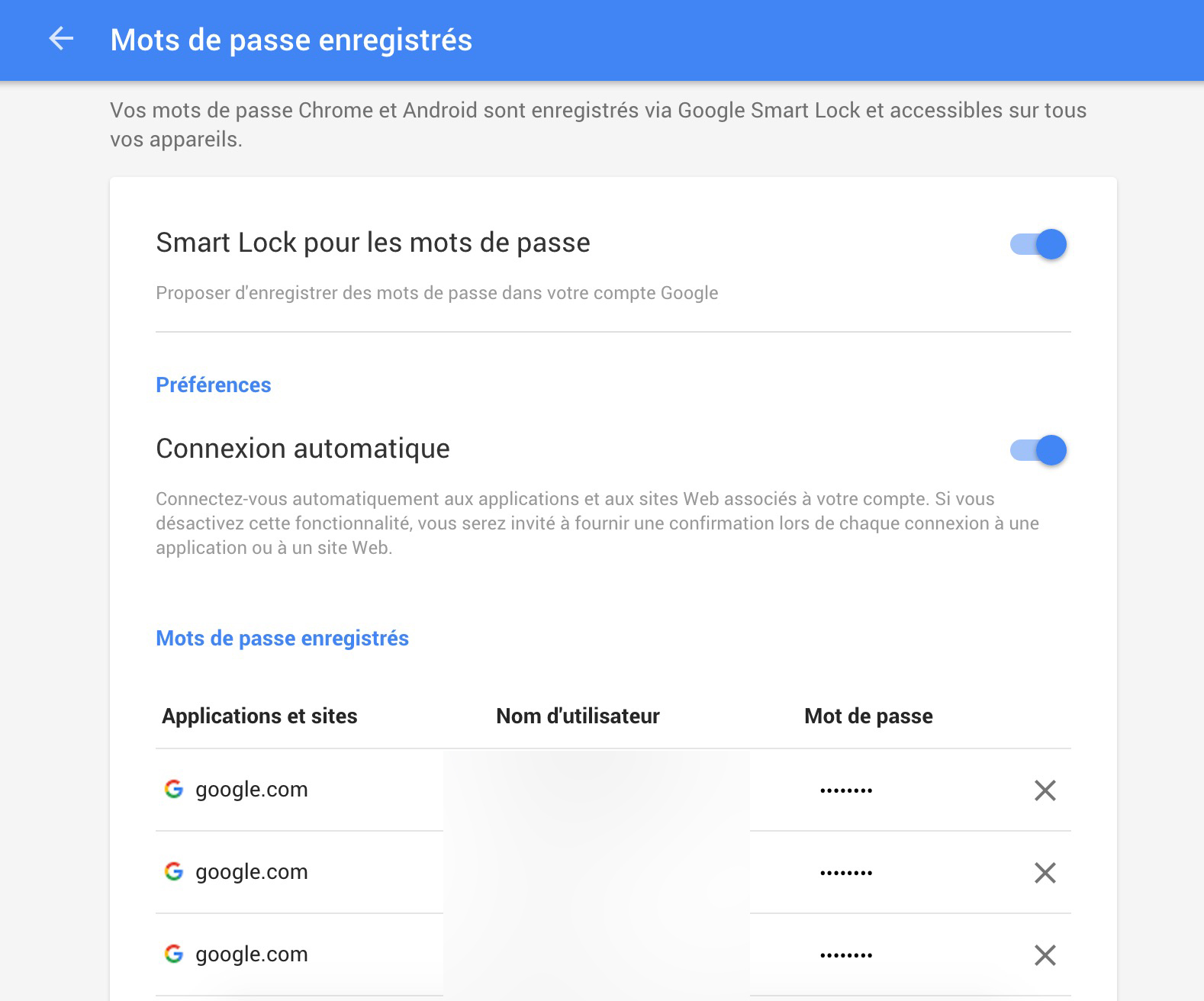 Et vous avez terminé. Les mots de passe sur la page de Google ne seront plus visibles dans les détails du compte. Si vous voulez de nouveau les avoir, ouvrez à nouveau le menu avancé des paramètres de synchronisation, et cliquez sur « Utiliser les paramètres par défaut ».