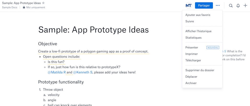 Vous pouvez ajouter du texte, des tableaux, des images et des éléments Web intégrables, comme un tweet ou encore une vidéo YouTube, et de collaborer avec d’autres, avec lesquels vous avez partagé votre document. Les gens peuvent mettre en évidence en temps réel des commentaires sur votre travail, des membres de l’équipe en les mentionnant « @ » (@yohann, par exemple) pour attirer leur attention et même ajouter des autocollants dans les conversations. Lorsque vous avez terminé, vous pouvez cliquer sur le bouton « Présenter » pour montrer votre travail, comme vous le feriez avec des diapositives d’un PowerPoint.