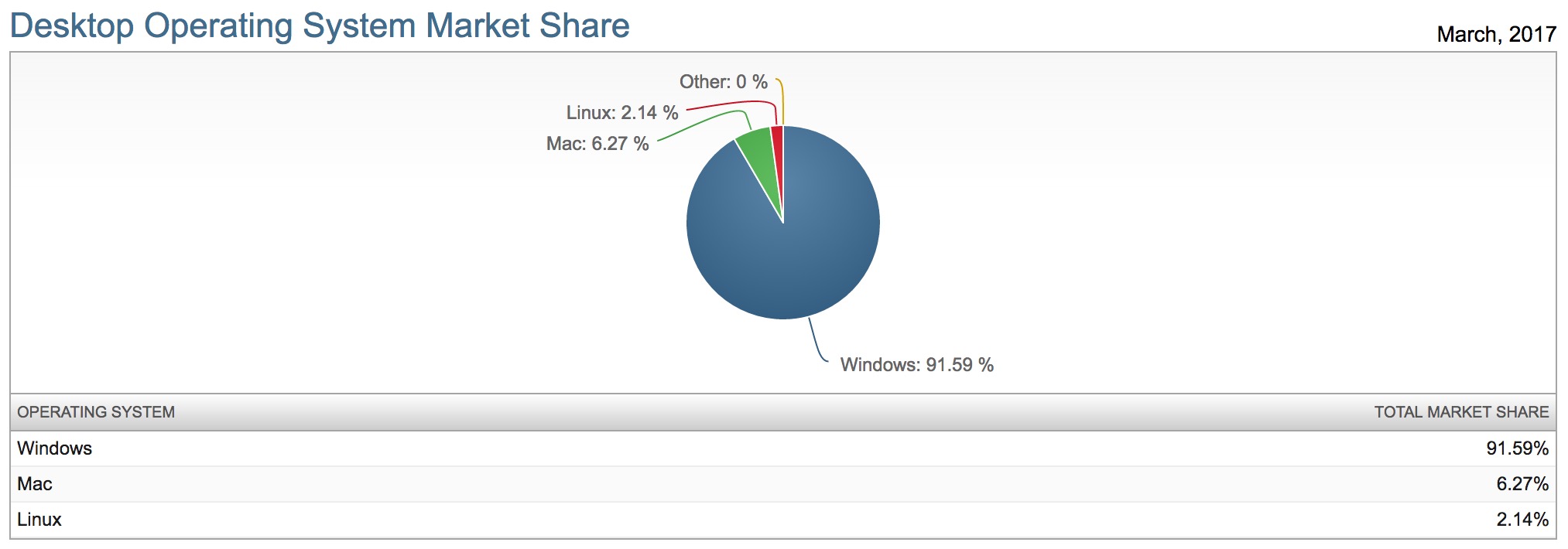 Et, les statistiques fournies par NetMarketShare pour le mois de mars 2017 montrent que Windows est non seulement le premier choix pour les ordinateurs de bureau à travers le monde, mais il maintient également un niveau qui permet à Microsoft de n’avoir absolument aucune raison de craindre que quelque chose puisse bientôt changer à cet égard.