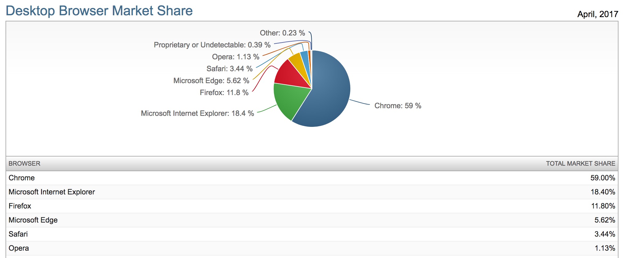 Mais, l’arrivée de la mise à jour a généré peu d’intérêt pour le navigateur Edge, selon les nouvelles données fournies par NetMarketShare. En effet, celles-ci montrent que le navigateur Web par défaut dans Windows 10, Edge, a amélioré sa part de seulement 0,01 % le mois dernier — notez que Creators Update a été poussée le 5 avril en téléchargement manuel et le 11 avril depuis Windows Update.