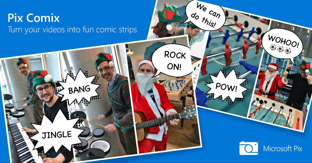 Photosynth n’est pas seul à arriver dans cette nouvelle version de Pix. Microsoft ajoute également une nouvelle fonctionnalité nommée Pix Comix, qui utilisera l’apprentissage automatique pour sélectionner les « images les plus intéressantes » dans une vidéo et en créer une bande dessinée. Une fois cela fait, vous serez en mesure d’ajouter des bulles à votre création, en transformant votre cliché en une fidèle bande dessinée.