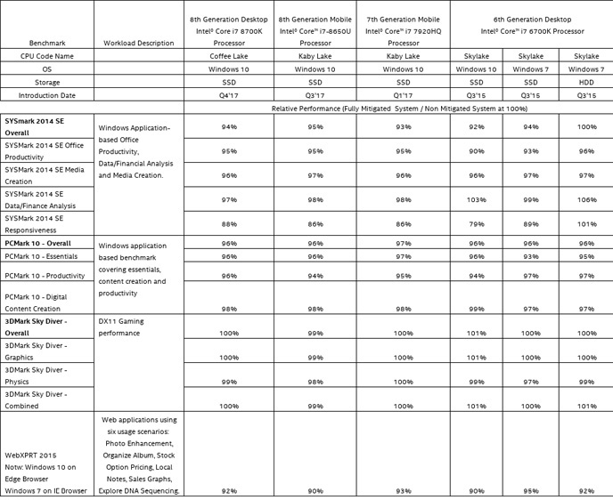 Les résultats complets des tests comparatifs d’Intel et de l’impact sur les performances des correctifs Meltdown et Spectre sur diverses générations de processeurs peuvent être trouvés dans l’image ci-dessus.