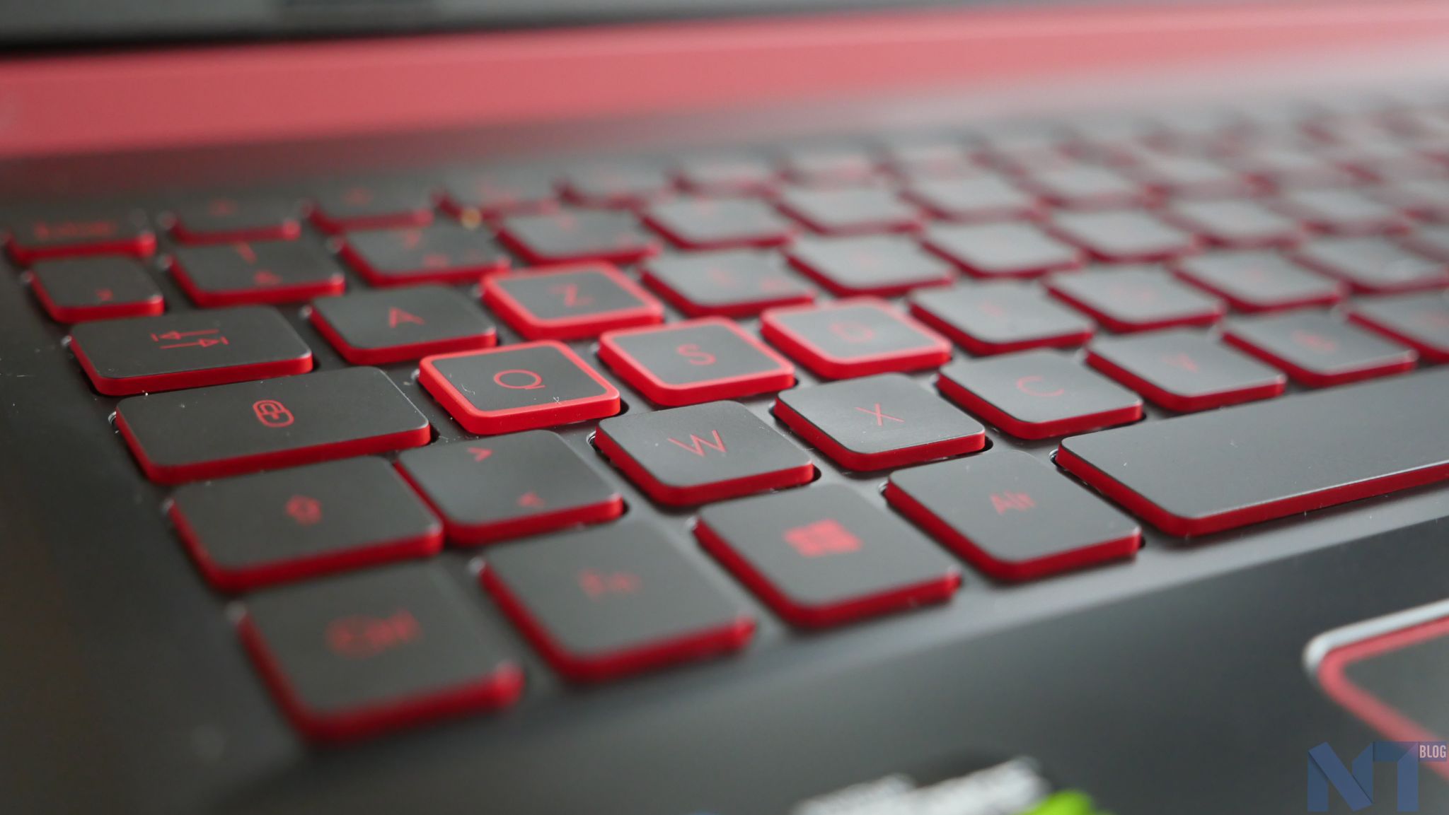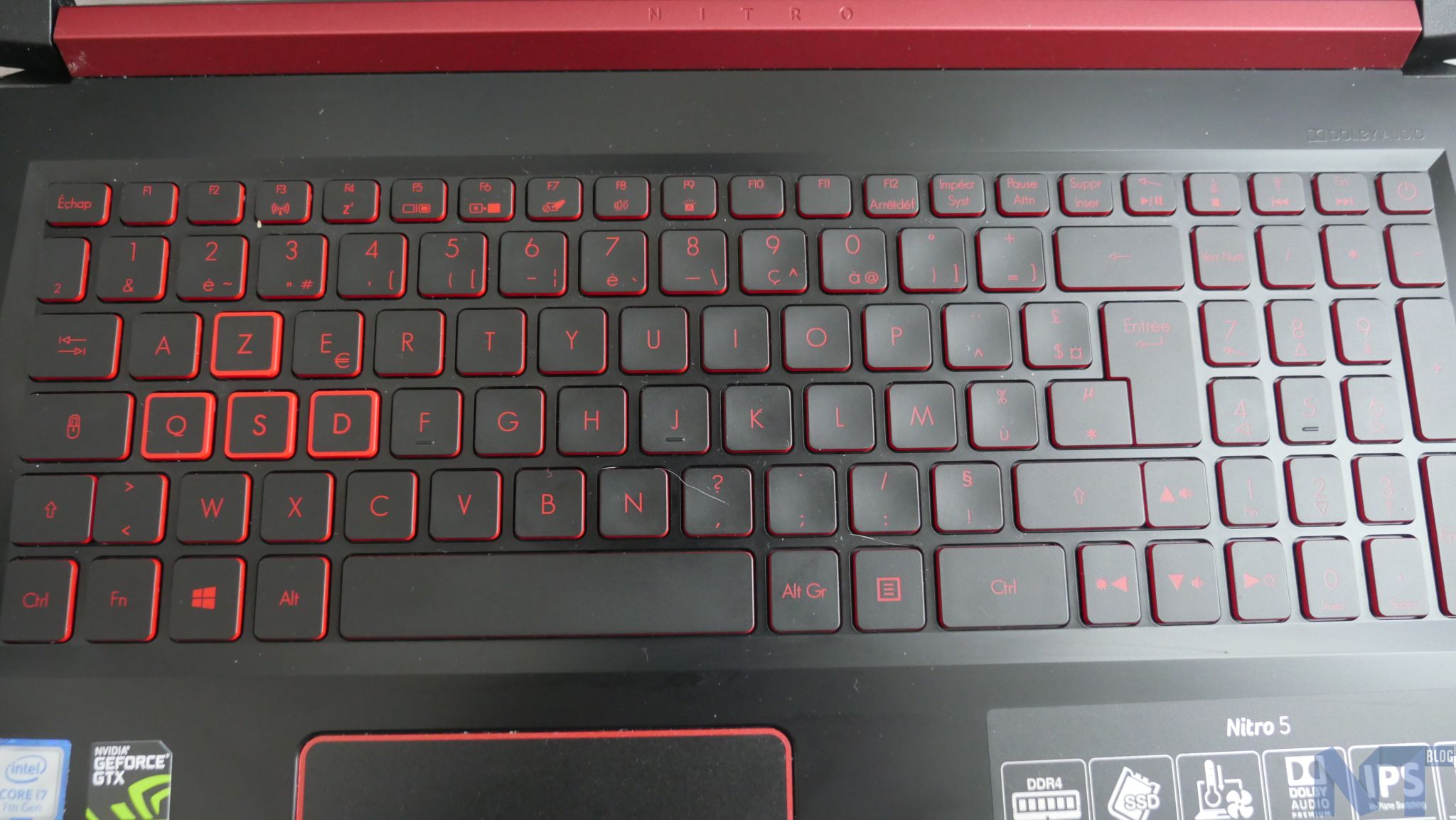 Le clavier est doté d’un rétro éclairage rouge, permettant de correctement voir où l’on tape dans la pénombre et les touches ZQSD (permettant habituellement de se déplacer en jeu) sont mises en valeur par un petit cadre blanc autour afin de correctement positionner les doigts en jeu. Par ailleurs, sur une note plus esthétique, le rétroéclairage rouge renforce particulièrement bien le design et la silhouette de l’ordinateur.