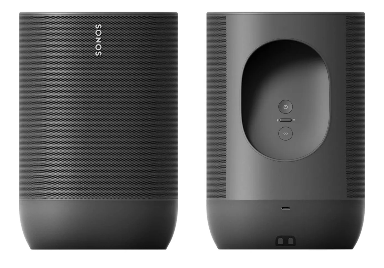 Les images nous donnent un premier aperçu de la station de base fixe ainsi que de la poignée intégrée grâce à laquelle la Sonos Move peut être retirée et transformée en une enceinte Bluetooth traditionnelle par un bouton à l’arrière.