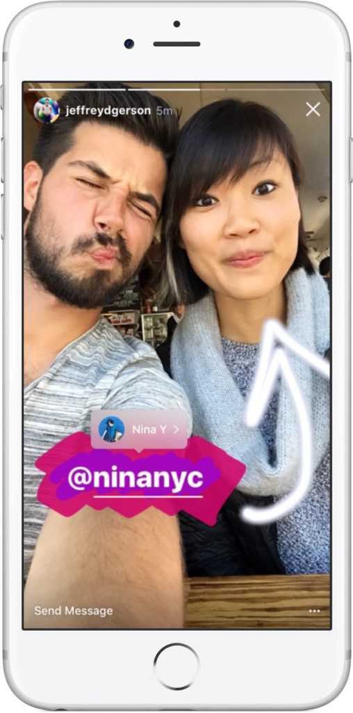 L’ajout des mentions permet essentiellement aux créateurs d’identifier des personnes dans leurs Instagram Stories. Il suffit de prendre une photo ou une vidéo, puis commencez à taper. Une fois que vous tapez le symbole @ suivi du nom d’utilisateur Instagram de quelqu’un, ils seront identifiés dans la story.