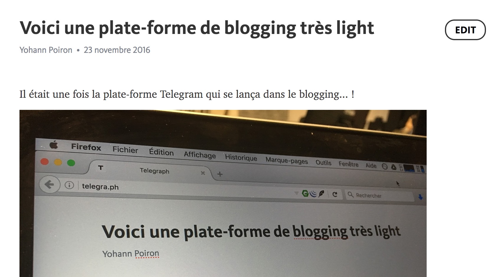 C’est la plate-forme de blogging la plus légère qu’il existe. Il suffit de se rendre sur telegra.ph, d’ajouter un titre et votre « nom », et vous êtes prêt à sortir votre plus belle plume. Vous pouvez ajouter du texte et le formater avec du Markdown, et vous pouvez même incorporer des images à partir de votre ordinateur, ainsi que des tweets et des vidéos YouTube et Vimeo.