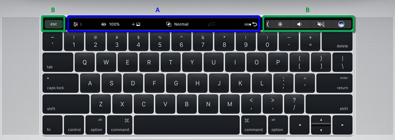Maintenant, vous pouvez ajouter des fonctionnalités de Photoshop à cette liste. La Touch Bar prend en charge les commandes contextuelles, ainsi que des entrées génériques. Et, elle peut afficher des boutons tactiles familiers comme le tap (tapoter), le drag (tirer) et le slide (glisser).