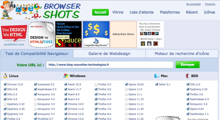 L’utilisation du service est simple. Tout ce que vous avez à faire, c’est de taper l’URL du site pour lequel vous voulez vérifier son rendu, et cocher sur quels navigateurs vous voulez voir. Cliquez sur le bouton “Envoyer” et le tour est joué ! Vous aurez une capture d’écran du site Web pour chaque navigateur.