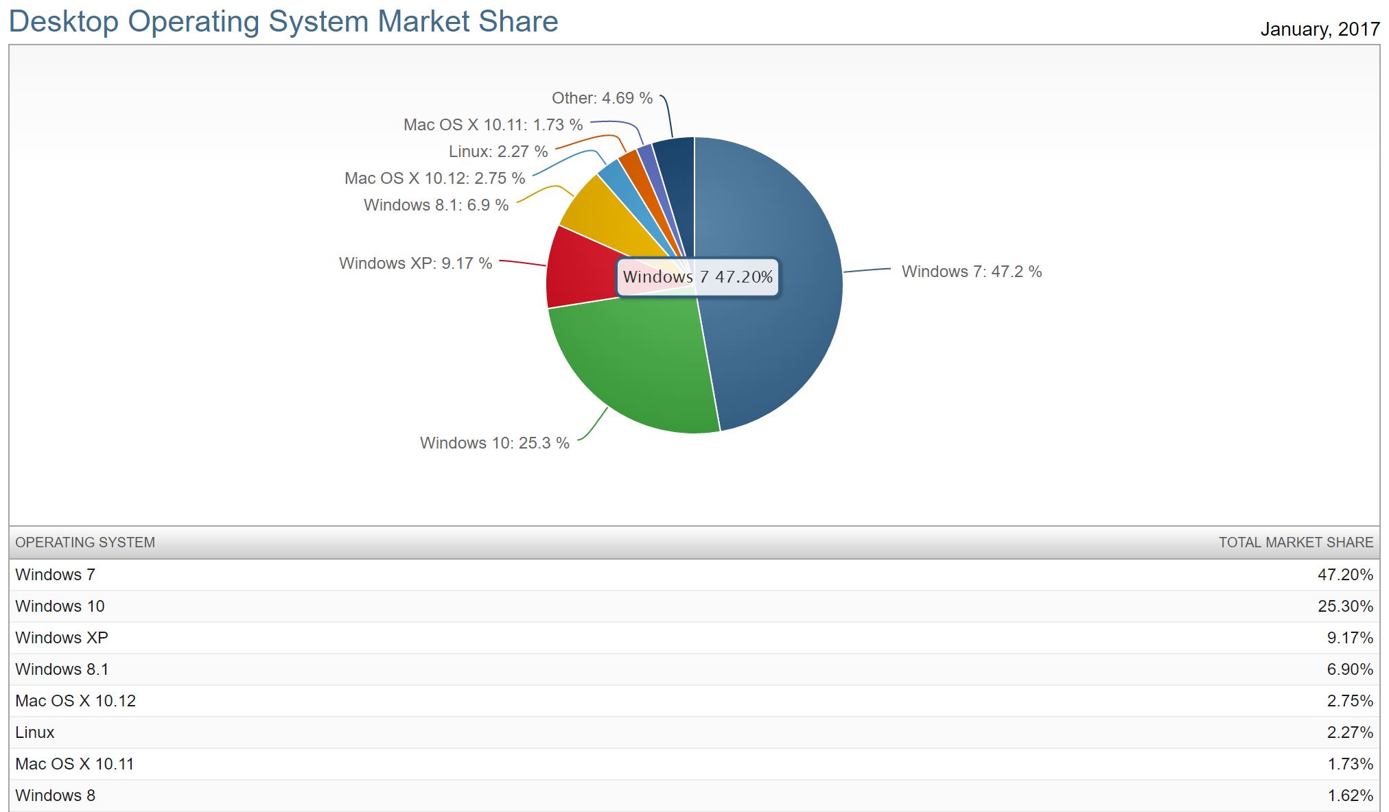 Dans le même temps, Windows 7 a chuté, passant de 48.34 % à 47.2 % de parts de marché entre décembre 2016 et janvier 2017. En janvier 2016, Windows 7 avait une part de marché de 52,47 %, ce qui signifie qu’une grande partie de l’augmentation de la part de marché de Windows 10 provient d’une baisse constante d’utilisateurs sous Windows 8.x, Windows XP et macOS.
