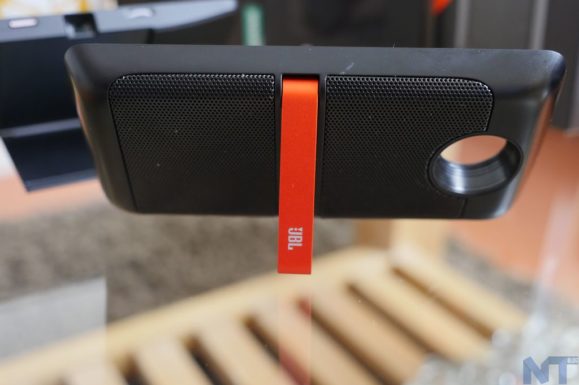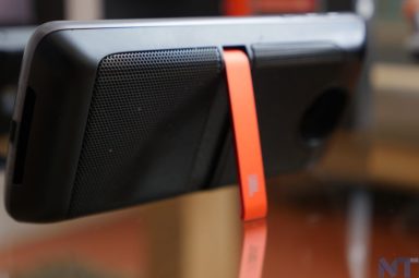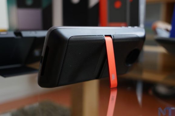 Motorola a également établi un partenariat avec JBL pour profiter du son stéréo SoundBoost, qui permet de disposer d’un puissant haut-parleur à l’arrière du smartphone. Là encore, le smartphone est épaissi avec le module. Le son est d’une excellente qualité, mais pas aussi puissant que les meilleurs haut-parleurs Bluetooth que vous trouvez sur le marché. Et, il comprend une béquille à portée de main qui permet de faire tenir le smartphone. Le JBL SoundBoost fournit également 10 heures d’autonomie avec sa batterie de 1 000 mAh intégrée. Ce module est vendu 99 euros.