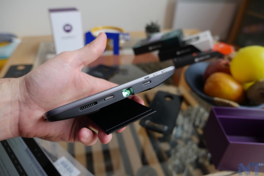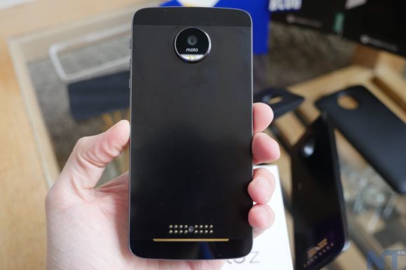 La nouvelle connexion qui est plus révolutionnaire — et favorable pour les consommateurs — est les broches en bas de la coque arrière du Moto Z qui permettent de facilement clipser un module. Ces 16 connecteurs plaqués or alimentent les données entrée/sortie entre le smartphone et un Moto Mod. Bonne nouvelle, le smartphone et les Moto Mods sont aimantés, de telle sorte que les accessoires interchangeables se fixent très aisément.