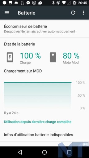Bien que celui-ci ait réussi à tenir une journée avec une utilisation « standard », c’est-à-dire en n’étant pas constamment dessus, il est très loin des 30 heures que Motorola mentionne en usage mixte. Dans la plupart des cas, je suis arrivé à 0 % en 24 heures.
