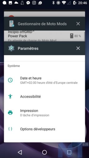 Motorola a abandonné l’essentiel de son logiciel il y a quelques années, et ses appareils ont clairement été que meilleurs. Si le Moto Z est arrivé avec Android Marshmallow, celui-ci est aujourd’hui sur Android 7.0 Nougat. Et à l’utilisation, on a l’impression d’être sur une version stock d’Android — il n’a pas de surcouche envahissante. Il n’y a que quelques modifications et personnalisations, et quelques aspects pour les Moto Mods, et quelques-uns des gestes supplémentaires que Motorola a implémentés, comme le fait de donner deux légers coups de poignet pour démarrer l’appareil photo, ou les deux coups vers le bas qui vous permettent d’allumer une lampe torche, et le fait de retourner votre téléphone pour activer le mode ne pas déranger pour les appels et les notifications.