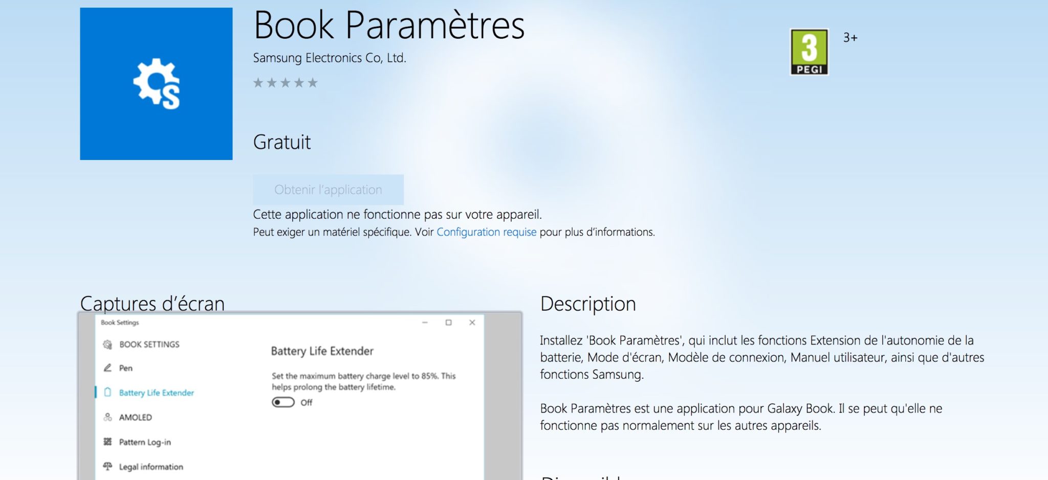 « Installez “Book Paramètres”, qui inclut les fonctions Extension de l’autonomie de la batterie, Mode d’écran, Modèle de connexion, Manuel utilisateur, ainsi que d’autres fonctions Samsung », peut-on lire dans la description de l’application. « Book Paramètres est une application pour Galaxy Book. Il se peut qu’elle ne fonctionne pas normalement sur les autres appareils ».