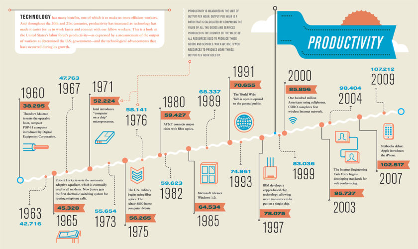 Comme date charnière, l’année 1971 a connu l’arrivée du microprocesseur d’Intel qui a permis une informatisation des systèmes, 1985 a vu la naissance du premier système d’exploitation Windows (1.0) facilitant aux entreprises l’acquisition d’un système d’exploitation, et l’ouverture du World Wide Web (Internet) au grand public leur permettant d’être visible partout dans le monde. Enfin récemment l’arrivée massive des appareils mobiles, et notamment la sortie de l’iPhone par Apple en 2009 a considérablement changé l’influence de la productivité puisque les utilisateurs peuvent rechercher les informations nécessaires.