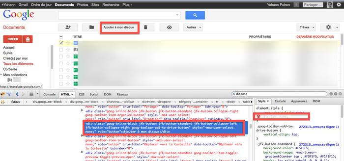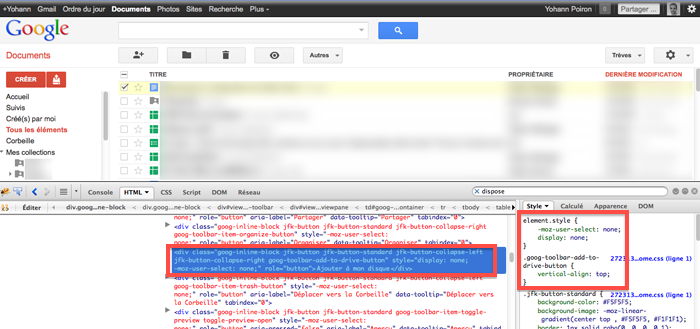 Afficher le bouton 'Ajouter à mon disque' de Google Drive depuis le code source de GDocs - Avec la propriété CSS display:none