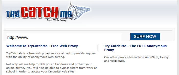 Enfin, TryCatchMe est le dernier outil à vous présenter. Il s’agit d’un énième proxy pour vous aider à protéger votre identité en ligne. Comme Fsurf, il a aussi la possibilité de déverrouiller les sites bloqués dans vos écoles et autres organisations.