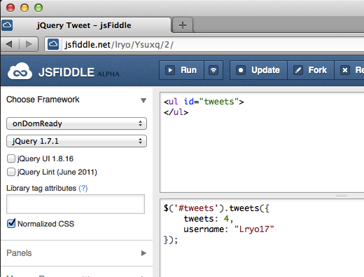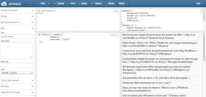 Pour vérifier mes dires, je vous propose de créer votre propre “fiddle” : vous pouvez également consulter des “fiddles” publics, comme celui de l’image suivante que j’ai créé qui va permettre de récupérer mes tweets à l’aide d’une librairie externe JavaScript, et qui se trouve ici. De là, vous pouvez afficher, exécuter, voire “trafiquer” le code, et y ajouter vos propres versions.