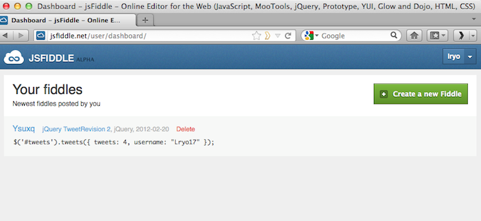 J’utilise le système depuis maintenant une quinzaine de jours, et je veux vous livrer quelques conseils pour utiliser efficacement jsFiddle. Tout d’abord, créez un compte et ouvrez votre session avant de créer vos “fiddles”. Pourquoi ? Tout simplement car il est plus facile d’organiser vos “fiddles” dans votre tableau de bord. Il ajoute également votre nom d’utilisateur du service à l’URL de vos “fiddles”.