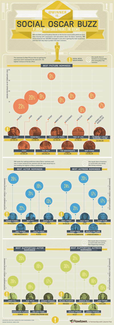 Comme l’indique Social Times, Flowtown, en partenariat avec Column Five, a réalisé une infographie ludique en s’appuyant sur les réseaux sociaux afin de prédire l’issue du spectacle de ce soir. Meilleur film, acteur, scénario, montage, photographie, son, etc…, découvrez ce que les réseaux sociaux prédisent dans l’infographie ci-dessous.