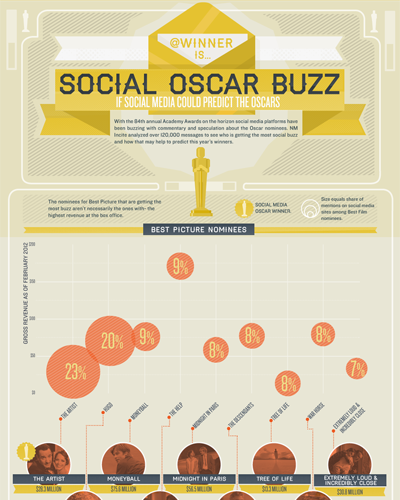 L’infographie, intitulée, “Social Oscar Buzz : Si les réseaux sociaux pouvaient prédire la cérémonie des Oscars”, est baseé sur une analyse d’NM Incite sur plus de 120 000 publications sur les réseaux sociaux. Curieusement, on peut constater que les films les plus cités, ne sont pas nécessairement ceux ayant de fortes entrées au box office, et les acteurs/actrices que l’on pressent sur les réseaux sociaux, sont différents de ceux des prédictions des Oscars.