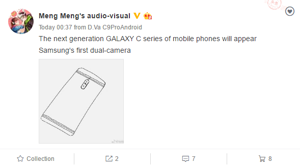 Cependant, des rumeurs mentionnent que le Galaxy Note 8 ne sera pas le premier smartphone de Samsung à se vanter d’une configure à double capteur, car un modèle de la gamme Galaxy C va la mettre en exergue auparavant. Le message est accompagné d’un croquis qui, franchement, réduit la crédibilité de la rumeur. Ce dernier semble avoir été réalisé à la main, et il ressemble davantage à un Xiaomi Mi 5s ou un Mate 9, plutôt qu’un modèle de la gamme Galaxy C de Samsung.