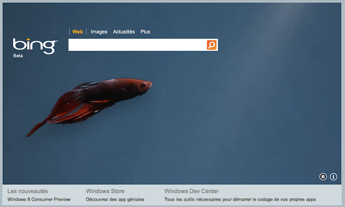 En plus de cette page dédiée au téléchargement de l’OS, Microsoft a également créé une page spéciale sur son moteur de recherche, Bing ! On y voit un poisson nageant dans l’océan, sans doute font-ils référence au Betta, étant un poisson, ainsi que des liens vers les futures pages de Windows 8 (inaccessibles pour le moment).