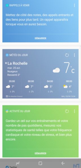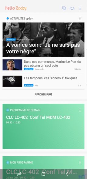 La page d’écran d’accueil la plus à gauche sur le Galaxy S8+, pour une raison quelconque, est nommée « Hello Bixby », plutôt que « Bixby ». C’est un écran analogue à Google Now, qui regroupe beaucoup d’informations, notamment sur votre style de vie, comme les alarmes, les prochains rendez-vous de l’agenda, les rappels, les dernières news, les prévisions météorologiques, les pages Web fréquemment visitées, et plus encore. Il agit comme un résumé de votre journée.
