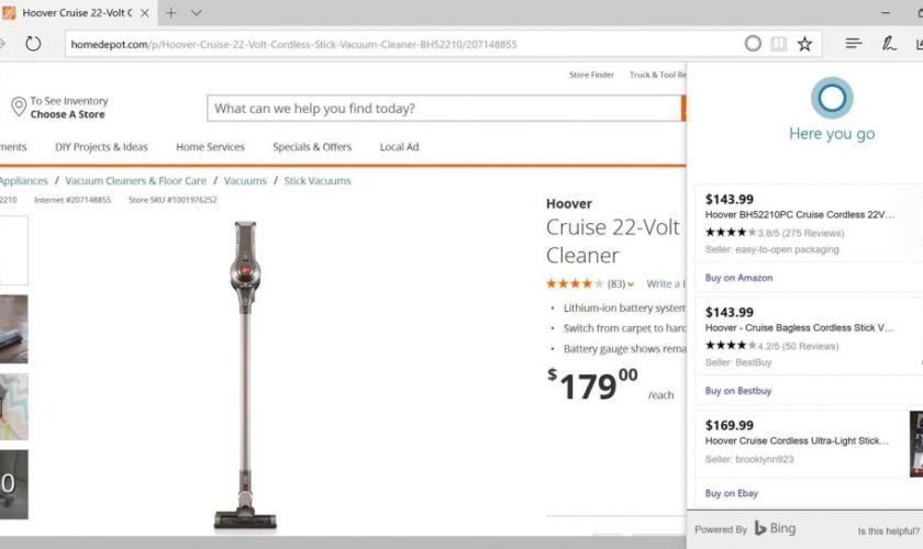 Une fois activée, l’alerte affiche des prix comparés pour n’importe quel élément que vous regardez, si vous avez les informations pertinentes en main. Comme d’autres fonctionnalités pour aider les gens à acheter, la vérification des prix peut être visualisée en cliquant sur l’icône de notifications de Cortana dans la barre d’adresse, a déclaré le directeur de programme de Microsoft, Dheeraj Mehta. Un exemple de la fonctionnalité est présenté ci-dessous :