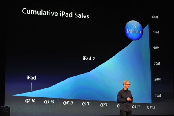 Tim Cook ouvre la Keynote d’aujourd’hui en parlant de l’incroyable croissance d’Apple, notamment après ce qu’il appelle les appareils post-PC. Il indique que ces iDevices ont été vendus à plus de 172 millions d’unités, ce qui représente 76% du CA d’Apple au précédent trimestre (période de Noël).