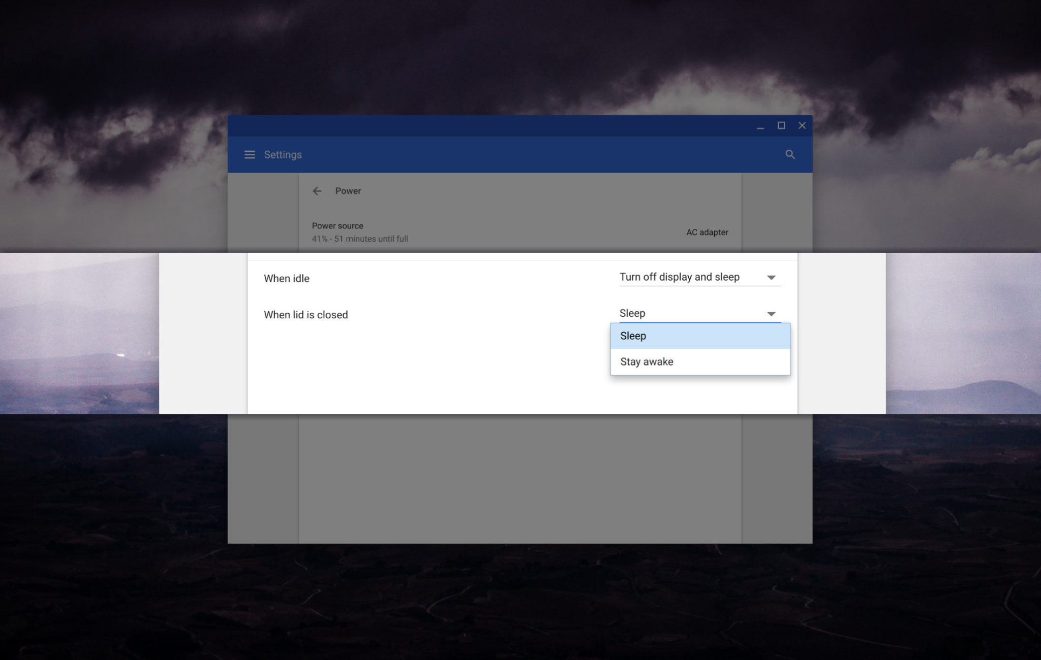 Le développeur a partagé sur sa page Google+ une capture d’écran de la nouvelle page de « Paramètres d’alimentation » de Chrome OS. Comme on peut le voir, celle-ci va permettre de contrôler la gestion de l’alimentation lorsque le capot de l’ordinateur portable est fermé et lorsque votre Chromebook est inactif. Par exemple, vous pouvez enfin choisir de garder votre Chromebook éveillé lorsque le capot de l’ordinateur est fermé, ou simplement le configurer pour que votre périphérique passe en mode veille, ce qui est actuellement l’action par défaut.