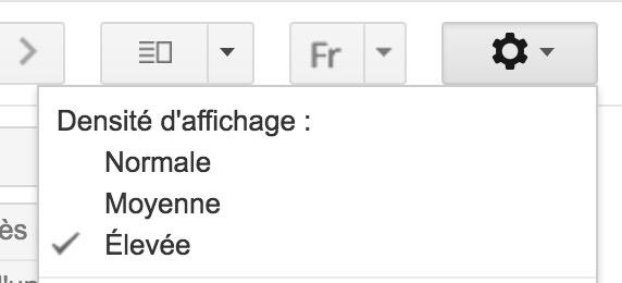Lorsque vous cliquez sur l’icône de l’engrenage dans le coin supérieur droit de Gmail, l’une des premières choses que vous verrez dans le menu déroulant qui en résulte est une option pour basculer entre les densités d’affichage : normale, moyenne et élevée. En optant pour « Élevée », vous allez gagner beaucoup d’espace, ce qui vous permet de voir plus d’informations sur chaque ligne.