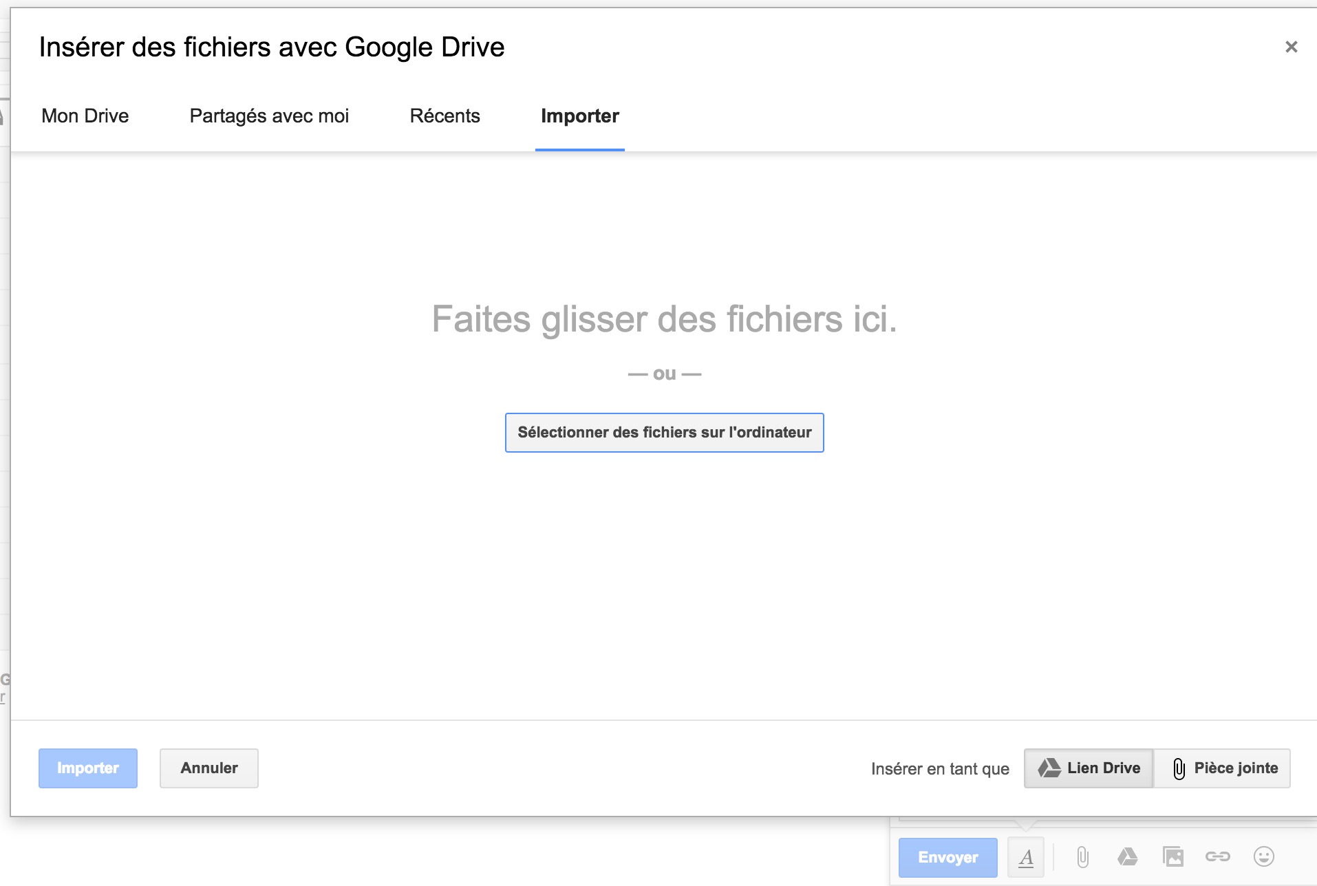 Si vous ne voulez pas perdre de temps à ajouter des pièces jointes pour des documents déjà sur la plateforme de Google, utilisez Google Drive. Chaque fenêtre de saisie d’un nouvel e-mail est équipée d’une icône Drive, qui vous permet de rapidement inclure des fichiers Drive à partir de votre navigateur. C’est également pratique si vous devez partager des fichiers qui ne sont pas stockés sur le périphérique que vous utilisez.