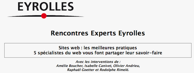 Le 27 mars 2012 de 18h30 à 20h, les éditions Eyrolles vous invitent dans leurs locaux, c’est-à-dire à Paris afin de participer à un événement exceptionnel autour du Web : les meilleures pratiques. Cet événement, mettra en avant les plus grands spécialistes du Web qui seront là pour vous faire partager leur savoir-faire.