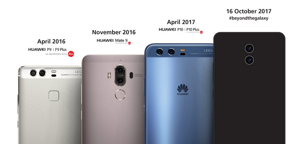 L’image montre le Huawei Mate 10 aux côtés des modèles P9, Mate 9 et P10, avec leurs mois et année de lancement. Le Mate 10 est le plus grand des quatre smartphones phares figurant dans l’image, et il arrive avec le hashtag « #beyondthegalaxy », qui indique que le Mate 10 est beaucoup mieux que n’importe quel smartphone de Samsung. Il convient également de noter que tous les smartphones P9, Mate 9 et P10 sont équipés de deux caméras à l’arrière. L’image montre l’arrière du smartphone révélant ainsi la configuration verticale de la caméra à double capteur près du centre, mais ne montre aucun capteur d’empreintes digitales à l’arrière.