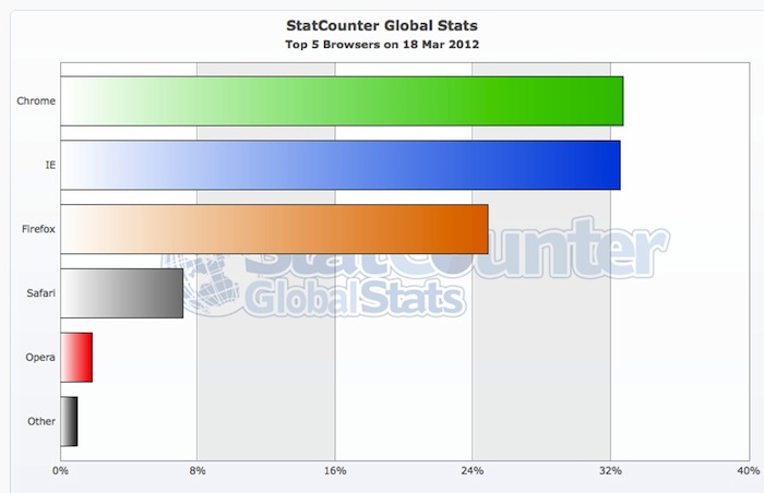 Si l’on en croit les chiffres ci-dessous et consultables depuis ce lien, Chrome comptabilise 32,71% des parts de marché, suivi de très prêt par Internet Explorer avec une part de 32,5%, et enfin Firefox se classe en troisième position avec 24,81%. Et puis, il reste quelques miettes pour Safari (7,13%) et Opera (1,86%)…