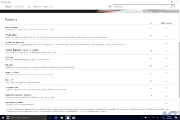 Avant toute chose, voici un tableau comparatif présentant les fonctions disponibles sur Windows 10 S ou Windows 10 Pro :