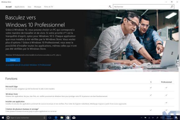En effet, certains périphériques arrivent préinstallés avec Windows 10 S, qui est verrouillé au Windows Store pour les applications et les jeux. La raison ? Ce dernier se veut plus sécurisé, et permet à l’OS d’être plus réactif et de démarrer plus rapidement. Heureusement, Microsoft offre aux périphériques sous Windows 10 S une possibilité de mise à niveau vers Windows 10 Pro, débloquant ainsi possibilité d’installer des applications en provenance du Web.
