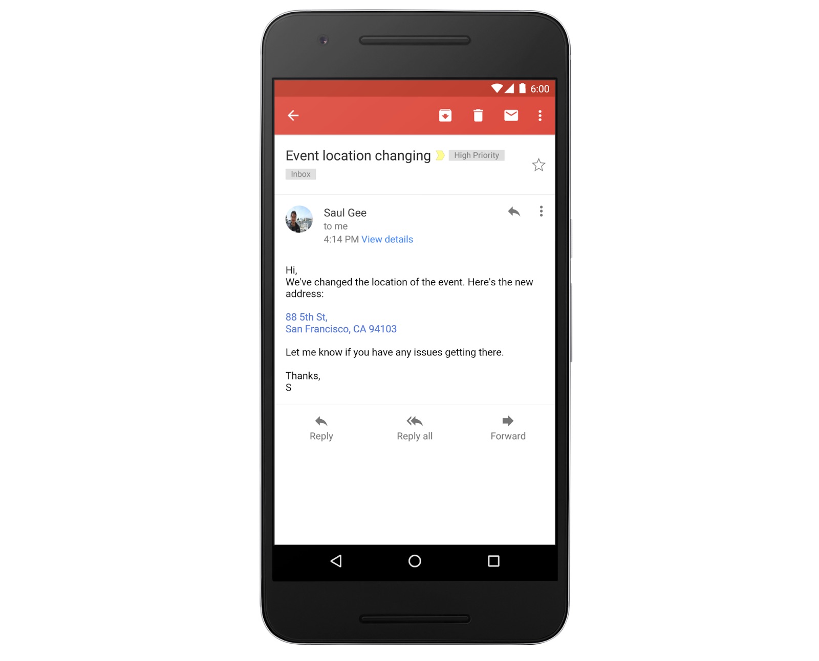 Les liens qui font référence à une adresse s’ouvriront dans Google Maps. En cliquant sur une adresse mail, une nouvelle fenêtre de composition s’affiche dans votre client de messagerie et les numéros de téléphone vont lancer un nouvel appel dans Hangouts ou votre application de téléphone par défaut.