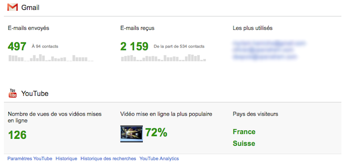 De plus, il fournit également des analyses personnelles, sur les endroits où l’on a été (pour les utilisateurs de Google Latitude), le nombre de mails envoyés et reçus, et le volume de vos recherches, le nombre de vidéos vues sur Youtube, etc…