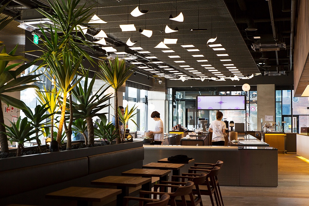 Et, il s’agira de la boutique Baskin Robins Brown, ouverte pour la première fois le 1er septembre 2017. Installée à Séoul, en Corée, elle a profité des dernières innovations de LG en matière de lampes OLED souples et rigides, offrant une grille de lumière aérienne, et se transformant en une expression ludique dans la boutique. Cette grille commence par un ensemble rigide de lampes et se termine avec les mêmes modèles carrés qui se tordent, avec un effet de flottaison.