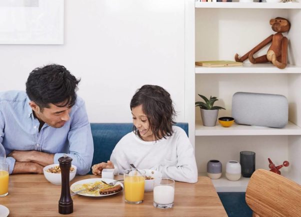 Par exemple, l’audio est ajusté en fonction de l’environnement physique. Mettez l’enceinte dans le coin d’une pièce, et les signaux audio seront adaptés si l’enceinte n’est pas au milieu d’une pièce. Vous pouvez également utiliser le Google Home Max comme une enceinte Bluetooth, un périphérique Cast ou le connecter à d’autres dispositifs par des câbles auxiliaires.