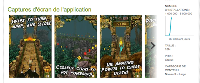 Après avoir revendiqué plus de 45 millions de téléchargements en sept mois sur la plateforme iOS d’Apple, Imangi Studios a annoncé que le premier million de téléchargement du désormais célèbre Temple Run sur Google Play s’est fait seulement après trois jours que l’application soit lancée sur Android.