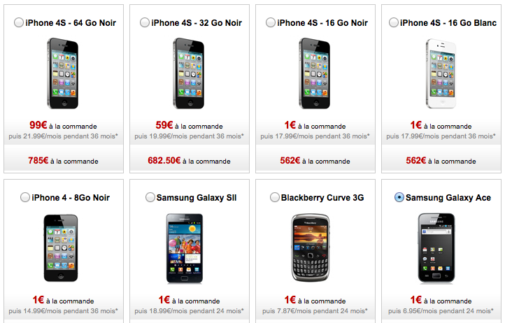 - iPhone 4S – 16 Go blanc ou noir : 1 € à la commande puis 17.99 € par mois pendant 36 mois, soit un prix total de 648.64 €. Ou bien 1 € à la commande puis 25.77 € par mois pendant 23 mois, soit un prix total de 619.61 €. Ou bien 562 € si vous décidez de l’acheter en une fois à la commande. Contre 629 € si vous le commandez directement sur l’Apple Store