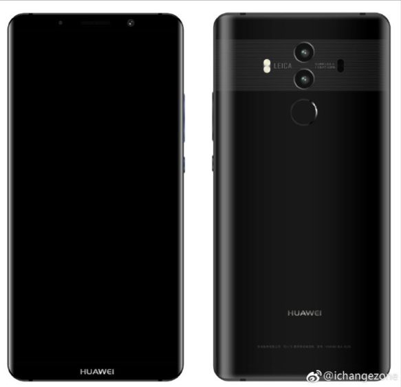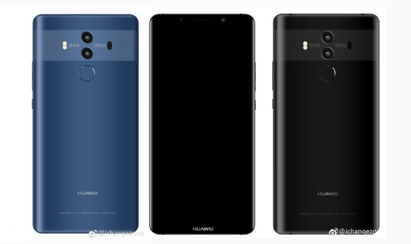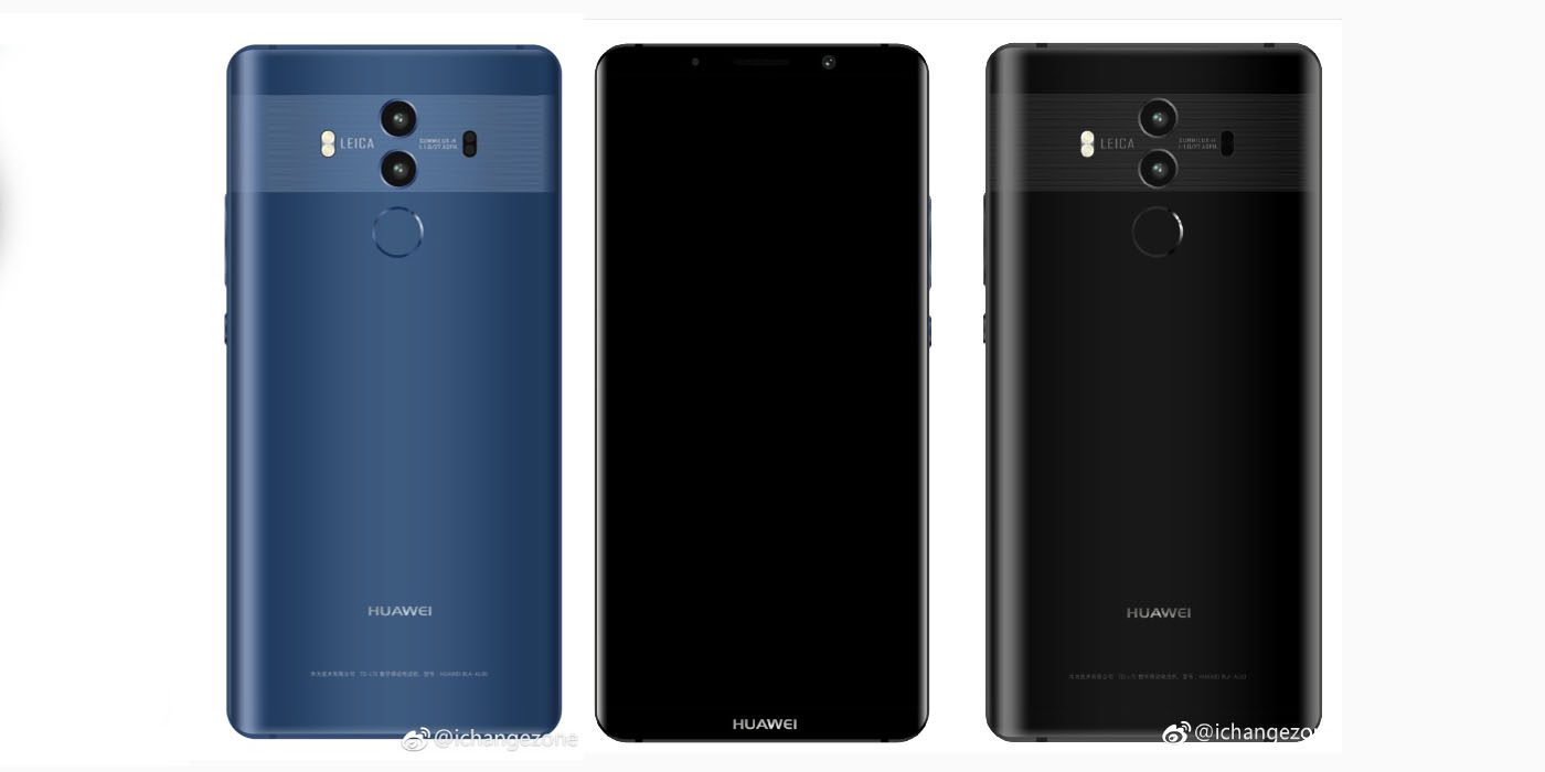 Outre l’affiche, la source a également affiché deux rendus du futur Huawei Mate 10. Comme pour la fuite de Evan Blass la semaine dernière, nous retrouvons le design bicolore de Huawei, ainsi que les bords colorés disponibles à l’avant sur le modèle bleu. À partir de ce cliché, en particulier sur le modèle bleu, on peut voir à quel point les bords sont minces sur les côtés, ainsi qu’au-dessus de l’écran. Il est également important de noter que le verre semble être légèrement courbé sur les côtés.
