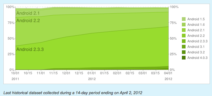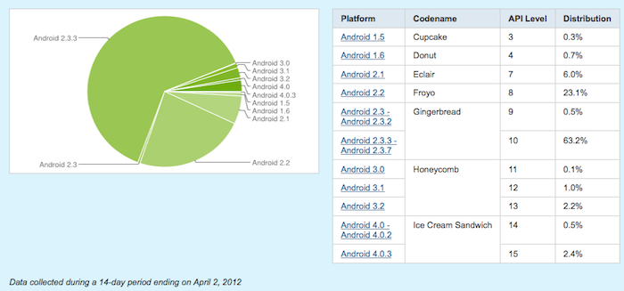Alors que fin Février lors du Mobile World Congress je vous annonçais que plus de 300 millions d’appareils Android sont en service dans le monde, un constat pouvait être fait : “Android est un système d’exploitation diversifié, avec des utilisateurs qui utilisent le système sur une grande variété de versions, du plus ancien à la toute dernière version, 4.0, nommée Ice Cream Sandwich. Jusqu’à présent, Ice Cream Sandwich est embarqué sur un très petit nombre de dispositifs (1% selon les derniers chiffres)”.