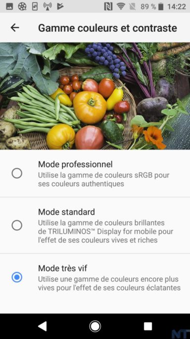 Le mode professionnel utilise la gamme de couleurs sRVB standard et fournit les couleurs les plus réalistes possible. Mais, il n’est peut-être pas le mode le plus agréable pour une utilisation quotidienne, car les couleurs semblent très plates. Le mode standard est le réglage par défaut de l’écran, qui augmente le dynamisme pour un aspect plus vif et utilise la gamme de couleurs TRILUMINOS de Sony. Le mode super-vif fournira à l’écran encore plus de vivacité, mais personnellement je n’ai pas forcément apprécié les couleurs trop saturées et le contraste qui rend le contenu moins naturel ou trop sombre.